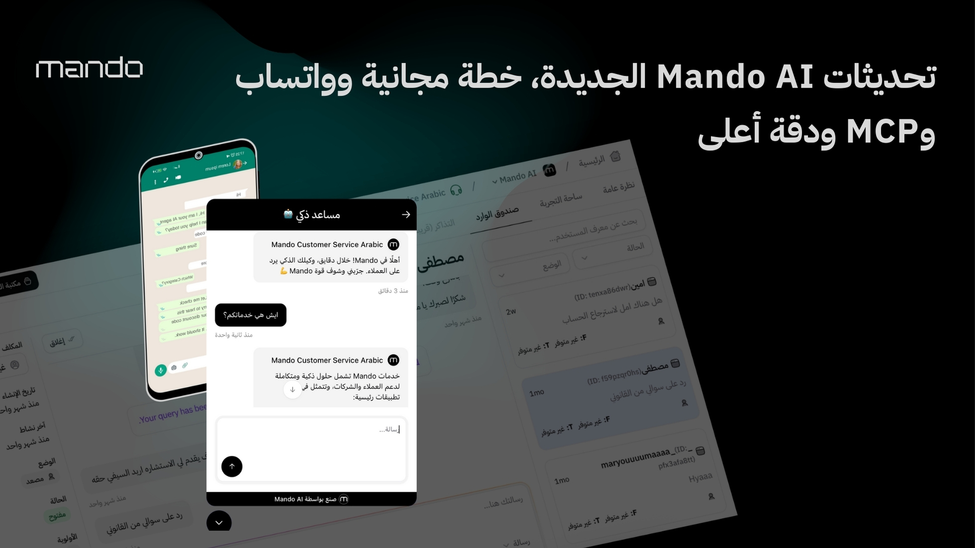 مميزتحديثات Mando AI الجديدة، خطة مجانية وواتساب وMCP ودقة أعلىاكتشف تحديثات Mando AI، خطة مجانية بحدود واضحة، بدءاً من 29 دولاراً، تكامل واتساب، دعم MCP، ولوحة تحكم بـ 19 لغة ودقة أفضل للاستخدام اليومي.منذ شهر واحد